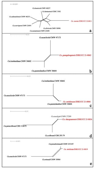 The results of the pairwise homoplasy index (PHI) test of five Calonectria new species and closely related species using both LogDet transformation and split decomposition. (a) Ca. cassiae; (b) Ca. guangdongensis; (c) Ca. melaleucae; (d) Ca. shaoguanensis; (e) Ca. strelitziae.