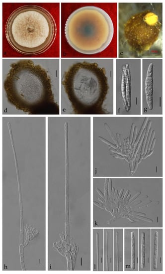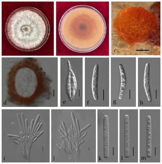 Calonectria aconidialis (ZHKUCC 21-0031: New host record) (a,b) Culture characteristics on MEA after 7 days ((a), upper view; (b), reverse view); (c) Ascomata; (d) Vertical section through an ascoma; (e) An ascus; (f–h) Ascospores; (i,j) Conidiogenous apparatus; (k–m) Macroconidia; Scale bars: c = 100 μm; d = 50 μm; (e–m) = 10 μm.