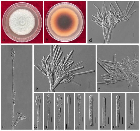 Calonectria auriculiformis (ZHKUCC 21-0053: New host record) (a,b) Culture characteristics on MEA after 7 days (a) upper view; (b) reverse view); (c) Macroconidiophores; (d–f) Conidiogenous apparatus; (g–k) Vesicles; (l–o) Macroconidia; Scale bars: (c–o) = 10 μm.
