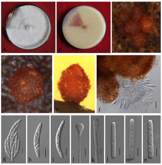 - Jayawardena, R.S.; Hyde, K.D.; Jeewon, R.; Ghobad-Nejhad, M.; Wanasinghe, D.N.; Liu, N.; Phillips, A.J.L.; Oliveira-Filho, J.R.C.; da Silva, G.A.; Gibertoni, T.B.; et al. One stop shop ii: Taxonomic update with molecular phylogeny for important phytopathogenic genera: 26–50. Fungal Divers. 2019, 94, 41–129. [Google Scholar] [CrossRef]