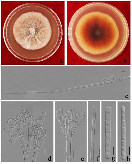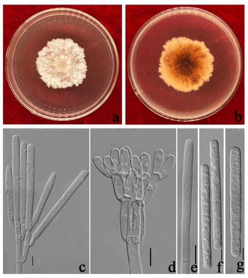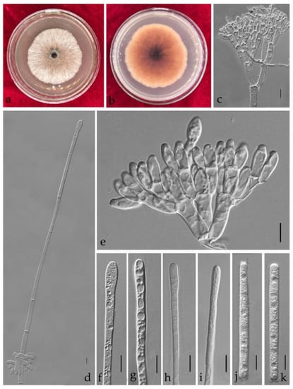 Culture characteristics—Colonies fast growing at 25 °C on MEA, growth rate 7.2 mm/d (n = 5), circular, producing abundant white aerial mycelium, reverse lightly red brown.