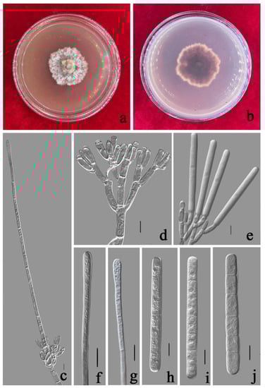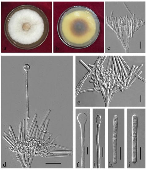 Calonectria hongkongensis (ZHKUCC 21-0016: New host record) (a,b) Culture characteristics on MEA after 7 days ((a) upper view; (b) reverse view); (d) Macroconidiophores; (c,e) Conidiogenous apparatus; (f–j) Vesicles; (h,i) Macroconidia; Scale bars: (c–i) = 10 μm.