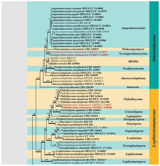 Notes: The monotypic genus was introduced to accommodate Neoangustimassarina sichuanensis, which formed a distinct clade within Amorosiaceae (Figure 1). Neoangustimassarina resembles Angustimassarina in forming globose to subglobose ascomata, hyaline, and septate ascospores surrounded by mucilaginous sheaths [38]. However, Neoangustimassarina differs from the latter in having immersed ascomata without a pore opening, broader asci (broad clavate to cylindric-clavate vs. cylindrical to cylindric-clavate), and the septa of the ascospores (1-septate vs. 1–3-septate). We, hereby, introduce the new genus based on the distinctiveness of morphology and multi-gene phylogeny.