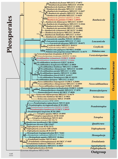The Pleosporales was invalidly introduced by Luttrell [9], and later revised by Barr [10], based on the family Pleosporaceae with the type species Pleospora herbarum [11]. Members of Pleosporales usually have perithecioid ascomata, cellular pseudoparaphyses, bitunicate and fissitunicate asci, and various shaped, aseptate or septate ascospores, with or without a gelatinous sheath [12,13,14], and their asexual morphs are coelomycetes and hyphomycetes [12,13]. For example, asexual morphs of Bambusicola and Pseudotetraploa are the most common forms of coelomycetes and hyphomycetes in Pleosporales, respectively. Zhang et al. listed 26 families in Pleosporales [12], while Hyde et al. revised Pleosporales and accepted 41 families [13]. Hongsanan et al. redefined the families of Dothideomycetes and accepted 91 families in Pleosporales based on morphology and multigene analysis [15]. Currently, Pleosporales consists of approximately 91 families and 655 genera (including 41 genera incertae sedis) [16].