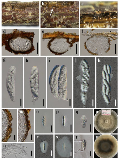 Figure 2. Neoangustimassarina sichuanensis (HKAS 123092, holotype) (a–c) Ascomata on host substrate. (d–f) Vertical section of ascoma. (g–k) Asci. (l,m) Structure of peridium. (n) Pseudoparaphyses. (o–s) Ascospores. (t) Germinated ascospore. (u,v) Colonies on PDA, above (u) and below (v). Scale bars: (d–f) = 100 μm, (g–t) = 20 μm.