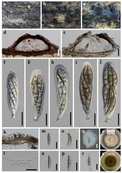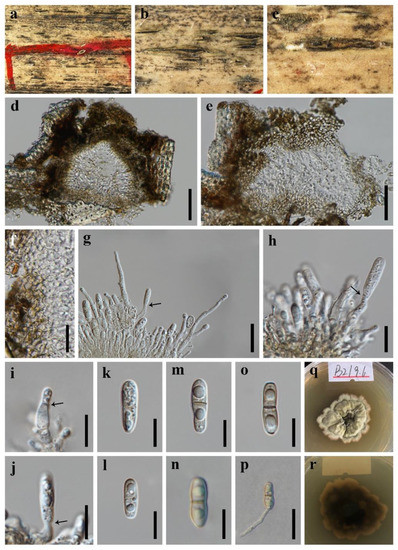 Figure 3. Bambusicola guttulata (HKAS 123091, holotype) (a–c) Conidiomata on surface of dead bamboo culms. (d,e) Vertical section of conidioma. (f) Wall of conidioma. (g–j) Conidiogenous cells bearing conidia (the arrows indicated how the conidiogenous cells produce conidia). (k–o) Conidia. (p) Germinating conidia. (q,r) Colonies on PDA, above and below. Scale bars: (d,e) = 50 μm, (f,g,p) = 20 μm, (h–o) = 10 μm.