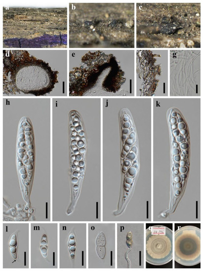 Figure 4. Flabellascoma sichuanense (HKAS 123094, holotype) (a–c) Ascomata on host substrate. (d) Vertical section of ascoma. (e) Ostiole, showing periphyses. (f) Structure of peridium. (g) Pseudoparaphyses. (h–k) Asci. (l–o) Ascospores. (p) Germinated ascospore. (q,r) Colonies on PDA, above and below. Scale bars: (d,e) = 50 μm, (f,p) = 20 μm, (g–o) = 10 μm.