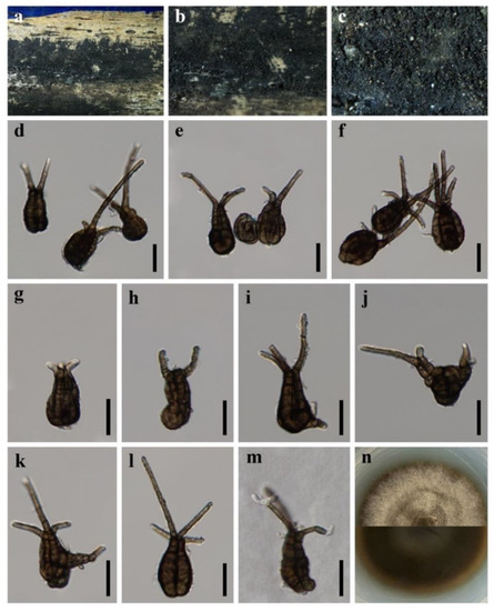 Figure 6. Pseudotetraploa bambusicola (HKAS 123095, holotype) (a–c) Colonies on natural substratum. (d–l) Conidia. (m) Germinating conidium. (n) Colony on PDA from above and below. Scale bars: (d–m) = 20 μm.