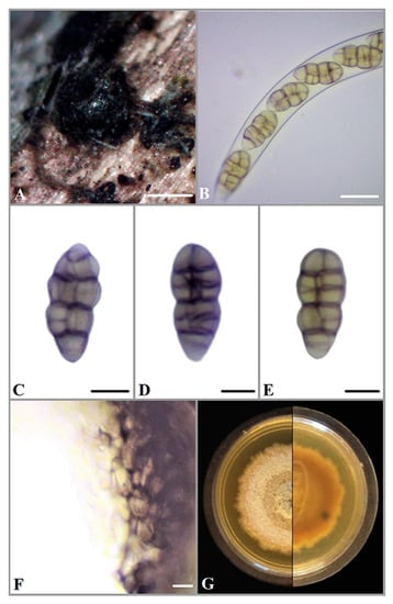 - Crous, P.W.; Wingfield, M.J.; Lombard, L.; Roets, F.; Swart, W.J.; Alvarado, P.; Carnegie, A.J.; Moreno, G.; Luangsa-Ard, J.; Thangavel, R.; et al. Fungal Planet Description Sheets: 951–1041. Persoonia 2019, 43, 223–425. [Google Scholar] [CrossRef] [PubMed]