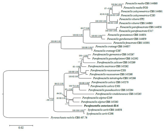 A combined set of ITS, LSU, tef1 and tub2 sequence data of 29 Cucurbitariaceae species was analyzed to define the taxonomic placement of the isolate EI-6 and infer its relationships at the intrageneric level. The performed RAxML analysis produced the phylogenetic tree with the topology similar to the multi-gene tree obtained in the recent study on fenestelloid clades of Cucurbitariaceae [4]. Individually generated single gene trees did not show conflicts in phylogenetic signals as well (data not shown). The best scoring ML tree with a log likelihood value of −3046.830912 is depicted in Figure 2. The isolate of the novel species P. ontariensis was clustered separately and formed a subclade with P. alpina. The new species was nested within the well-supported clade of Parafenestella spp. (96% ML, 51% MP, 1.00 BP).