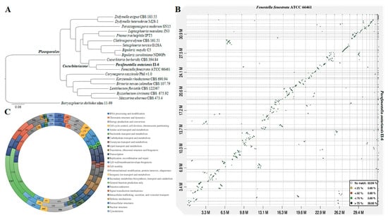 (A) ML tree generated from the concatenated alignment of 3 145 SCOs. (B) Dot-plot graph showing syntenic blocks between scaffold sequences of F. fenestrata and P. ontariensis. (C) Graph showing the KOG gene annotations of C. berberidis (inner), F. fenestrata (middle) and P. ontariensis (outer layer).