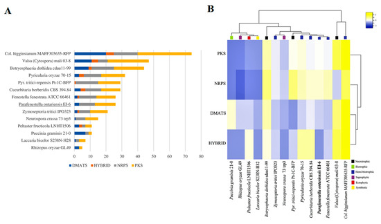 (A) Overall comparison of SM backbone genes in genomes of Cucurbitariaceae species and 11 other fungi with different lifestyles. (B) Heatmap graph showing SM clusters in Cucurbitariaceae and other fungal species with different lifestyles.