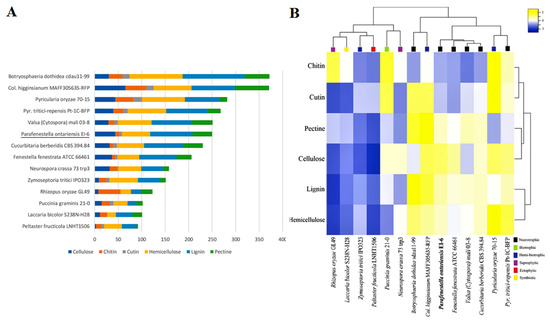 The CAZY content analysis was performed for the same set of species. It was found that the Cucurbitariaceae species were well equipped with the genes encoding CAZYs. The species contained an extensive set of auxiliary activity (AA) enzymes, carbohydrate esterases (CE), glycoside hydrolases (GH) and polysaccharide lyase (PL), which indicated their capacity to degrade plant cell walls effectively. In particular, the genomes of P. ontarienis were found to have 250 CAZY-related genes, C. berberidis (230) and F. fenestrata (206) (Figure 5A). It has also shown that the CAZY complement of P. ontariensis was very similar to necrotrophic V. mali. However, these two species carried a different numbers of genes involved in cellulose and hemicellulose degradation. Broadly, the species of Cucurbitariaceae had a much more expanded set of CAZYs than ectophytic P. fructucola (92), while it was significantly reduced compared to necrotrophic B. dothidea (372). The cluster analysis further confirmed the high similarity of CAZY content of the Cucurbitariaceae species with V. mali (Figure 5B). It was also demonstrated that the members of Cucurbitariaceae (P. ontariensis, especially) could encode a relatively high number of the genes involved in cellulose degradation. The further analysis of the selected CAZY families [11] has shown that the Cucurbitariaceae species formed a separate cluster with 25 modules (seven hemicellulose, six pectin, five cellulose, four cutin, three chitin) which are relatively expanded in at least two species in the sub-set compared to other species included in the analysis (Figure 6).