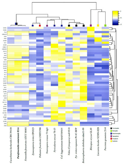Carbohydrate-active enzymes (CAZYs) play an important role in the invasion of plant hosts by fungi. Fungal species can produce different kinds of CAZYs involved in the breakdown, biosynthesis or modification of glycoconjugates, oligo- and polysaccharides [12]. Plant pathogenic and endophytic fungi produce various enzymes (e.g., glycoside hydrolase (GH)) to deconstruct cell wall polysaccharide families involved in cellulose and hemicellulose hydrolysis. CAZY content also varies among fungal species and often shows adaptation to nutrition type [13].