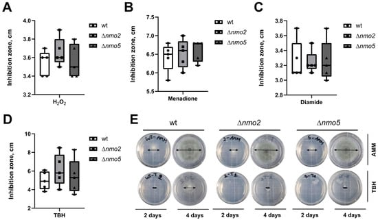 Phenotypic characterisation of wild-type, Δnmo2, and Δnmo5 A. fumigatus strains after being treated with various oxidative stressors. The sensitivity of A. fumigatus strains to different oxidative stress-inducing compounds was evaluated using inhibition zone (A–D) and droplet (E) assays. The inhibition zones in the diffusion assay were measured after adding a specific oxidative compound—(A) H2O2, (B) menadione, (C) diamide, and (D) tert-butyl peroxide (TBH). Circular-shaped data points correspond to wild-type, square-shaped to Δnmo2, and triangular-shaped to Δnmo5. In the droplet assay (E), 0.1 mM tert-butyl peroxide was added to agar plates. Black arrows indicate the diameters of fungal colonies. Data were obtained from 5 independent experiments, and the statistical test used was the one-way ANOVA test.