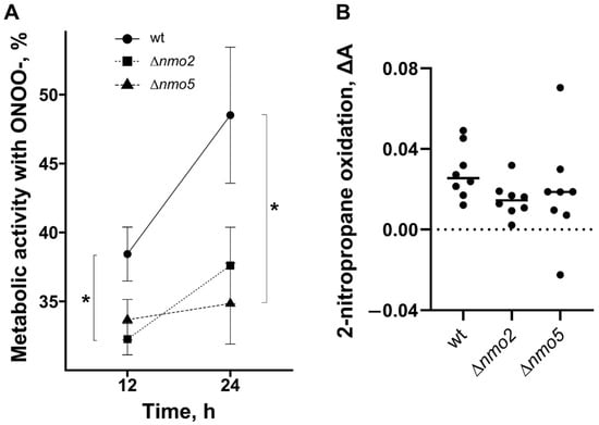 Nmos protect cells from nitro-oxidative stress by catalysing the oxidative denitrification of toxic nitroalkanes such as 2-nitropropane. To test whether the lack of Nmos results in reduced ability of the fungus to denitrify nitroalkanes, we performed an enzymatic activity assay to evaluate enzymatic 2-nitropropane oxidation by proteins isolated from each strain. Total proteins were extracted from the cell biomass to perform this assay, in which 2-nitropropane (nitroalkane) was used as a substrate for the reaction. According to the data (Figure 2B), both Δnmo2 and Δnmo5 strains showed a slight decrease in enzymatic activity. However, there was no significant difference when results from several experiments were compared. It is likely that changes in enzymatic activity were not observed in the deletion strains, because the applied substrate (nitropropane) was not converted specifically by Nmo2 or Nmo5, but rather by other remaining nitronate monooxygenases in these mutants. To sum up, Nmo2 and Nmo5 might contribute to peroxynitrite resistance in vitro (Figure 2A), which is independent of the enzymatic oxidation of 2-nitropropane.