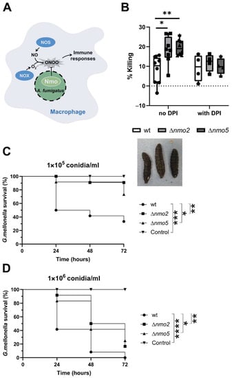In our study, the importance of A. fumigatus Nmo2 and Nmo5 for virulence was shown using in vitro macrophage and in vivo G. mellonella infection models. Although G. mellonella has been proven as a useful model to study fungal virulence, its drawbacks include evolutionary genetic divergence between mammals and insects, and the lack of an equivalent to the mammalian adaptive immune response [43]. In future studies, virulence assessments should, therefore, be carried out with different models, such as murine models. Our research also indicates that A. fumigatus nitro-oxidative stress responses are beneficial against host immunity. To gain more insights into A. fumigatus–host interactions, further investigations are needed to reveal the exact molecular mechanisms by which nitro-oxidative stress responses are activated and regulated in A. fumigatus during infection. Finally, to further evaluate the potential of Nmos to become targets for antifungals, the generation of recombinant proteins will be useful to fully understand the biochemical properties of these enzymes, and to predict and design new molecules for their inhibition.