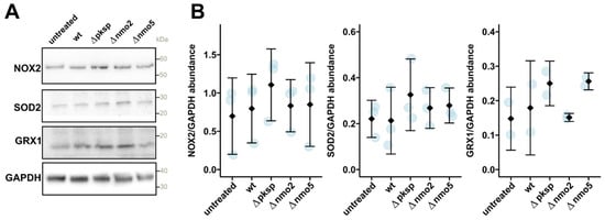 We next tested whether Nmos can alter nitro-oxidative homeostasis in immune cells. In the case of disrupted nitro-oxidative homeostasis, macrophages might react by increasing the abundance of antioxidant proteins while reducing the abundance of superoxide-producing NADPH oxidase. Interestingly, our study showed that when macrophages were infected with tested strains, there were no significant changes in the abundance of NADPH oxidase or major host antioxidant enzymes, namely, superoxide dismutase 2 and glutaredoxin 1 (Figure 4A,B). Here, we also included the ΔpksP strain in our analysis, which is known to be able to cause elevated ROS production in immune cells [27], and we used this as a positive control. Indeed, there was a slight increase in the abundance of antioxidant enzymes in macrophages infected with ΔpksP compared to the wild-type strain; however, this difference was not statistically significant (Figure 4A,B). To further evaluate the cellular redox state, we performed an in-gel analysis of enriched reversibly oxidised proteins in infected macrophages (Figure S5A). In this assay, oxidised proteins were enriched and loaded onto the gel for visualisation. Interestingly, we could not observe a consistent difference in the redox state of proteins in macrophages infected with wild-type vs. Δnmo2 strains (Figure S5B,C). Considering these findings together, Nmo2 does not significantly alter the abundance of antioxidant enzymes or the redox state of proteins in infected macrophages.