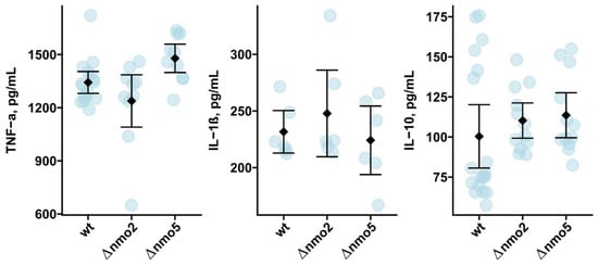Finally, we tested whether Nmo2 and Nmo5 might impact the macrophage production of inflammatory mediators—cytokines. Our focus was on TNF-α, IL-1β, and IL-10, which are among key regulators of antifungal immune responses and fungus-induced inflammation [28]. Here, we observed that the production of inflammatory TNF-α and IL-1β and anti-inflammatory IL-10 was not changed following infection with Δnmo2 and Δnmo5 in contrast to infection with the wild-type strain (Figure 5). Therefore, Nmo2 and Nmo5 contribute to the protection of A. fumigatus from killing by macrophages (Figure 3), but this cannot be explained by their effects on cytokine secretion by macrophages.