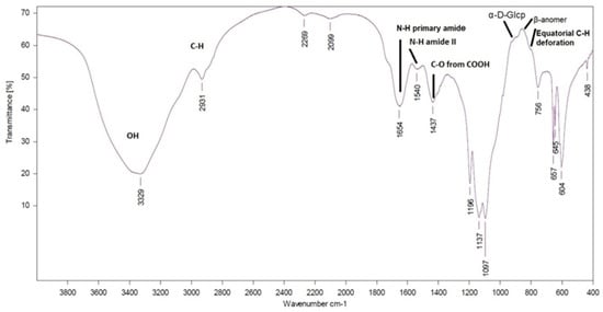 | 1455–1470 | 1437 | symetric stretching vibrations, C–H (CH2) in pyranose ring, in-plane bending of o–н (OH), C–O from COO− |