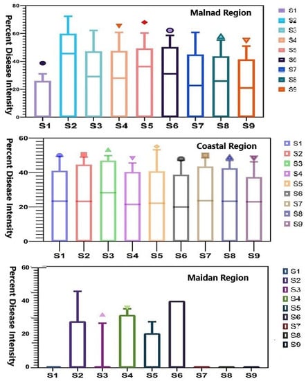The pathogen infection was found throughout the sampling points (except few points in Maidan areas) over the regions with varying disease intensity (PDI), which significantly differed across the studied regions of Karnataka. A significant difference in PDI was observed among sampling points in the Malnad region, where S2 exhibited a higher disease proportion than other points. In contrast, sampling sites in the coastal region did not show considerable differences in disease intensity that indicated almost similar trend was observed across the region. Disparately, no disease was observed in few sampling plots of the Maidan region (S1, S7, S8 and S9) even though the remaining plots exhibited slight variation with minimum disease proportion (Figure 3).