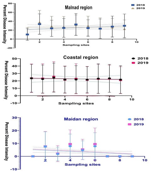 The temporal progress of arecanut fruit rot PDI during two consecutive years at sampling sites in each region. Each point was the mean of 18 weeks of PDI data at different sampling sites (n = 9) collected during 2018 and 2019. Graphs represented the mean, range and standard deviation of PDI, and the vertical bar represents the standard error of means.