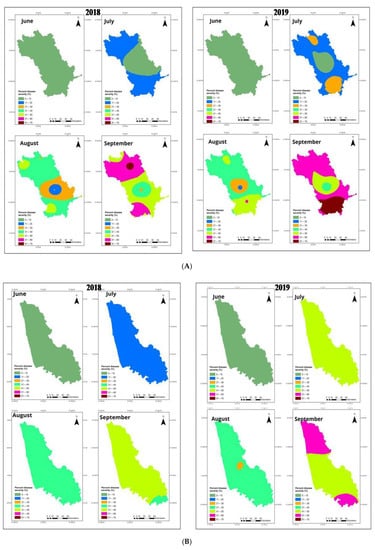 The disease intensity up to 51–60%, 41–50% and 31–40% was observed in 22.3%, 25% and 7.5% of the total surface, respectively, indicating spatial aggregation of disease during 2018. Subsequently, around 60%, 12% and 3% were observed in 2019 (Figure 5A). This pattern of spatial clusters evidenced that the disease intensity was varied among sampling sites of the region with varying disease proportions and identified risk areas highly vulnerable to the disease spread and occurrence.