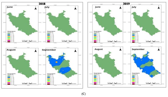 In 2018, 11–20% of disease intensity was observed in 55% of the total interpolated surface, and the remaining 5% of areas consisted of a disease proportion of about 21–30% (Figure 5C). The disease intensity during 2019 varied between 11% and 20%, which shared at 60% of the total surface, and only 1% had disease intensity ranged from 21–30%. It seems that general trend was maintained across the regions in both years.
