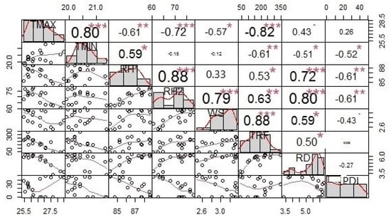 Correlation analysis between FRD intensity and climatic conditions across the 27 sampling sites s of Karnataka. Tmax (Maximum Temperature), Tmin (Minimum Temperature), RH1 (Morning Relative Humidity), RH2 (Evening Relative Humidity), WS (Wind Speed), TRF (Total Rainfall), RD (Number of Rainy Days) and PDI (Percentage Disease Intensity). Significance codes: *** —0.001, ** —0.01, * —0.05.