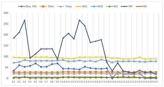 Furthermore, the plot indicating the maximal PDI of each of the 27 sites against integrated climatic variables over the 18 weeks period inferred in Figure 7. This clearly deciphered and supported the results of correlation analysis as well as allowed us to understand the impact of climatic indicators against PDI across the sampling sites.