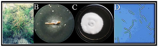 Wilted plants were observed in the field (A). Fungus was isolated from roots (B) and sub-cultured on PDA media (C). Microscopic image of isolated fungus was obtained at 40× magnification (D).