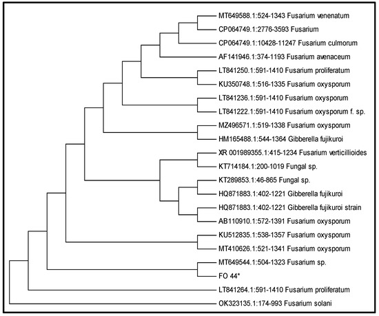Evolutionary relationship of isolated Fusarium oxysporum strain FO_44, with 21 closely related GenBank sequences.
