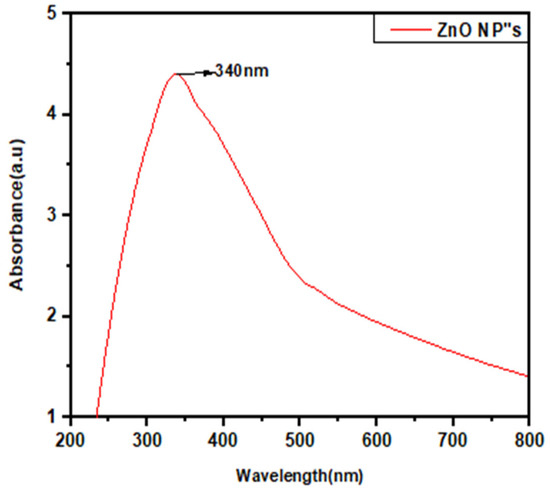 Surface plasmon resonance observation at 340 nm wavelength indicated the successful synthesis of ZnO NPs (Figure 3). The color of the cell-free culture changed from yellowish to whitish, indicating the reduction of zinc acetate by secondary metabolites of cell-free filtrate, which leads to the formation of ZnO NPs [31]. Moreover, the difference in the shape of absorbance peaks of zinc oxide and filtrate represented the reduction of zinc acetate salt into ZnO NPs. A similar peak of absorption for zinc oxide at 340 nm has been reported earlier [32].
