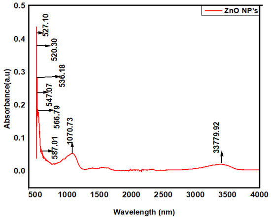 FTIR analyses were used for the determination of possible active biomolecules (Figure 4). These biomolecules are accountable for the reduction of Zn ions and capping of ZnO NPs. Obtained FTIR spectra showed absorption peaks at 3379.9 cm−1, indicating the NH group of primary aliphatic amines. The peak at 1070.83 cm−1 indicated the C-O group of alcohol and strong stretching at 587.01 cm−1 depicted the C-I group of halogen. The peaks at 566.79 cm−1, 536.18 cm−1, 527.10 cm−1, and 520.03 cm−1 identified the C-Br group of halogen compounds. Another strong stretching peak at 547.07 cm−1 displayed the C-Cl group of halogen compounds. The presence of amide groups and organic molecules indicates their role as reducing and capping agents.