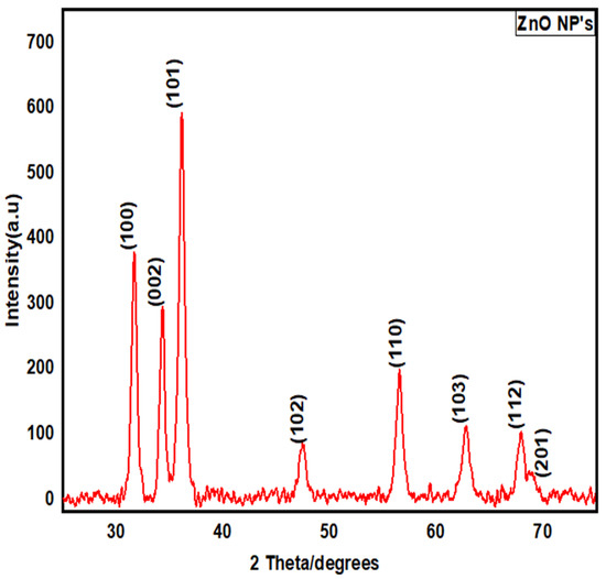 The XRD pattern showed various diffraction peaks (Figure 5), indicating the successful conversion of the precursor salt into ZnO NPs, during the process of calcination. The observed peaks were compared with standard JCPDS data (File No: 000361451). The distinct peaks at 2θ = 31, 34, 36, 47, 56, 62, 67, and 69 were assigned to (100), (002), (101), (102), (110), (103), (112), and (201), indicating the spherical structure of ZnO NPs. Using Debye–Scherer’s equation, the average size of the particle was determined as 13 nm. Biological material resulted in the agglomeration of small-sized nanoparticles.