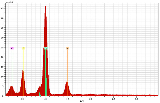 SEM micrograph showed spherical-shaped ZnO NPs (Figure 6.) The EDX spectrum confirmed a good percentage of zinc and oxygen signals on ZnO NPs (Figure 7). The elemental characterization of the nanoparticles revealed the presence of zinc (70.70%), oxygen (13.87%), aluminum (7.90%), and carbon (7.52%). The highest peaks of zinc and oxygen confirmed the synthesis of zinc oxide by the metabolites of the filtrate.
