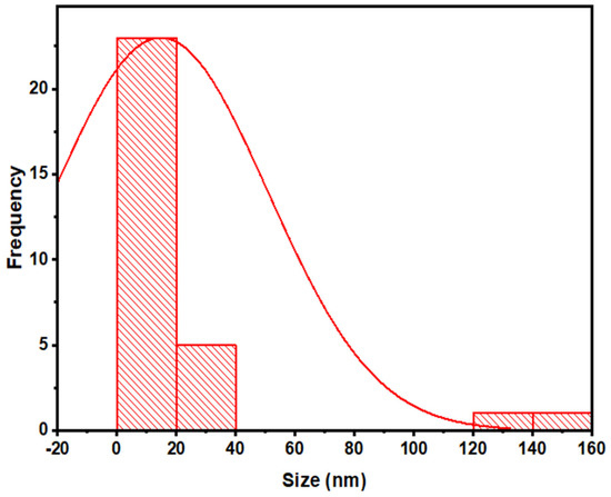 TEM can also be used to confirm the primary size and form of nanoparticles [33]. Results of this analysis revealed the spherical shape of ZnO NPs, having an average size of 14 nm (Figure 8). These results also confirmed the findings of XRD and SEM analysis. Size distribution indicated that the ZnO NPs were in the range of 5 nm to 27 nm (Figure 9).