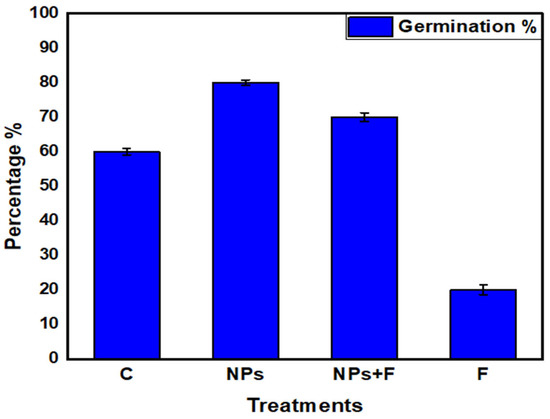 For each treatment, three pots were used. In each pot, 10 seeds were sown and placed in a glass house. Based on the emergence of the radicle (2–4 mm length), the germination was recorded after every 24 h. After 10 days of sowing, the germination percentage was determined by using the following equation [24].