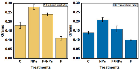 Fresh root/shoot ratios (A) and dry root/shoot ratios (B) of chickpea under different growth conditions. C = control (without fungus), NPs = seeds primed with 0.5 µg/mL ZnO NPs, NPs + F = seeds primed with 0.5 μg/mL ZnO NPs and sown in fungus inoculated soil, F = seeds sown in fungus inoculated soil.