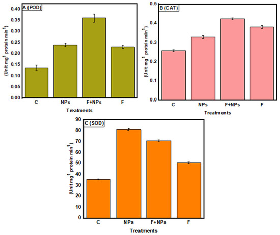 Both NPs treatment and fungus inoculation increased peroxidase activity, and the maximum enzymatic activity was observed under F + NPs treatment (Figure 17A). Catalase (CAT) enzyme showed the same trend (Figure 17B), and the maximum superoxide dismutase (SOD) activity was observed in NPs-treated plants, followed by F + NPs treatment (Figure 17C). Increased SOD in plants treated with ZnO NPs could be one technique for removing excess ROS and limiting pathogen invasion [5].