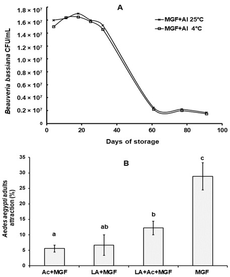 Beauveria bassiana BBPTG4 strain (A) conidia viability in microgranular formulation (MGF). Conidia viability was determined in MGF at time zero (4 d) (1.5 × 107 conidia/mL as active ingredient (AI) with MGF) and up to 91 d storage at 25 °C ± 2 °C or 4 °C ± 1 °C, as explained in the text. (B) Percentages of Ae. aegypti adults attracted to different treatments. Ae. aegypti adults were exposed to MGF without additive, MGF + acetone (added at 1% (w/v) of MGF), MGF + 100 µL/g of lactic acid at 85%, and MGF + 100 µL/g of lactic acid at 85% + 1% acetone/g of MGF and attraction percentages determined, as explained in the text. Data represent mean + SEM of triplicate determinations from three independent experiments. Same letter on each column indicates that treatments are not significantly different (HSD Tukey test; p ˂ 0.05).