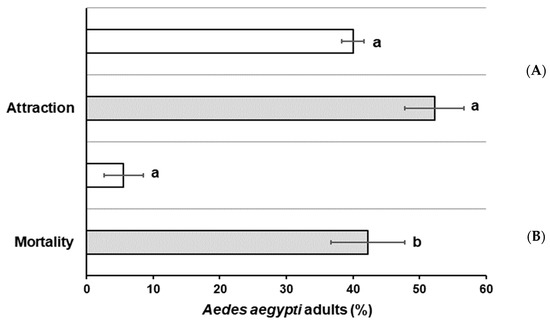 white bar) Beauveria bassiana as active ingredient (AI). (A) Attraction percentage and (B) mortality percentage after exposure to BBPTG4 on MGF. Data represent mean + SEM of triplicate determinations from three independent experiments. Same letter on each column indicates that treatments are not significantly different (Student t test; p ˂ 0.05).