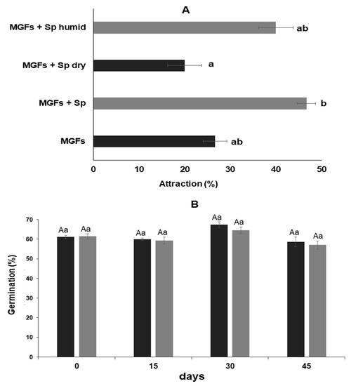 MGFs + Sp showed ~20% more attraction compared with MGFs (p > 0.05) and MGFs + Sp dry (p < 0.01) (Figure 3A). However, when testing dry or humid formulates, we did not detect significant differences between them (p > 0.05) (Figure 3A), although the humid formulate was 20% higher (Figure 3A).