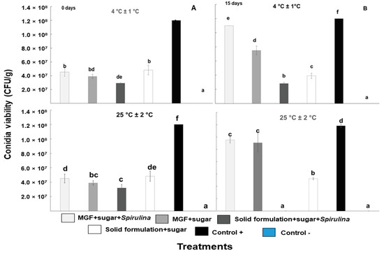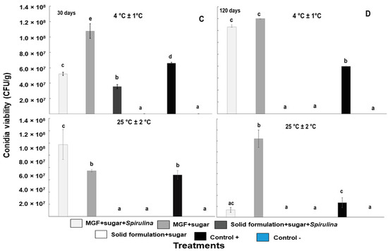 Results obtained after 30 d of storage at 4 °C or 25 °C, showed lower conidia viability among most formulations. However, MGF + sugar + Spirulina treatment had higher viability after storage at 25 °C temperature (1.17 × 108 CFU/mL). Similarly, MGF + sugar at 4 °C and MGF + sugar + Spirulina at 25 °C (1.1 × 108 and 1.2 × 108 CFU/mL, respectively), resulted in higher conidia viability compared with other treatments. In contrast, we did not observe viable conidia in solid formulation + sugar treatment stored at 4 °C temperature and solid formulation + sugar + Spirulina and solid formulation + sugar stored at 25 °C (Figure 4C).