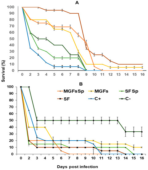 Survival percentage of Aedes aegypti adults exposed to four different formulations of the B. bassiana BBPTG4 strain stored for (A) zero days and (B) 30 d. The four different formulations stored at 4 °C and 25 °C. Data represent mean + SEM of triplicate determinations from three independent experiments. MGF + Sp = microgranular formulation + Spirulina, MGFs = plus sugar, SF = solid formulation, C+ = positive control, C− = negative control.
