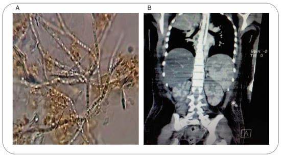 Identification of M. capitatus as the causal agent of IFI. (A) Microscopic evaluation (Zeiss Primo Star 415500 optical microscope, 40×) of a fresh sample of bile fluid with 20% of KOH, observing hyaline septate macrosiphoned hyphae structures. (B) Detection of M. capitatus invasion of internal organs with an abdominal CT scan. The coronal plane shows multiple injuries in the spleen and kidneys.