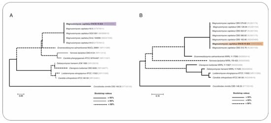 Maximum-likelihood phylogenetic trees were constructed with nucleotide sequences from the ITS and 28S rRNA gene markers, utilizing MEGAX software, the bootstrap test of 1000 replicates, and the Jukes-Cantor 69 (JC69) nucleotide substitution model computed on jModelTest version 2.1.10 [,]. The sequences were deposited in the GenBank with the accession numbers MN832904 (ITS) and MN833644 (28S). A phylogenetic reconstruction confirmed the identity of the fungal strain ENCB-HI-834 as M. capitatus, which clustered with other M. capitatus strains with a 100% identity (Figure 2A,B; Table S1). At the same time, antifungal testing was carried out with the Sensititre YeastOne® susceptibility system (Thermo Fisher ScientificTM, Waltham, MA, USA), a colorimetric broth microdilution method, as indicated by the manufacturer. The resulting minimum inhibitory concentration (MIC) values were as follows: posaconazole): posaconazole 0.25, amphotericin B 1.0, fluconazole > 8.0, itraconazole 0.25, ketoconazole 0.5, 5-flucytosine ≤ 0.06, voriconazole 0.25, and caspofungin > 16.0. No clinical breakpoints have been defined for Magnusiomyces spp. (Geotrichum spp. or Saprochaete spp.).