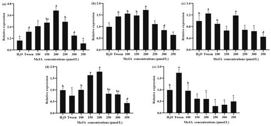Treatment with MeJA was found to significantly increase the content of total triterpenoids, most likely by increasing the expression of key genes in the triterpenoid biosynthesis pathway. We examined the changes in the transcript levels of five key triterpenoid biosynthesis pathway genes. It can be seen from the results that the expression of four genes showed a general upward trend with increasing concentrations of MeJA, indicating that MeJA can promote the transcription of these genes (Figure 2a–d). In this experiment, the transcript level of the LS gene showed a downward trend (Figure 2e), indicating that MeJA treatment may inhibit its expression.