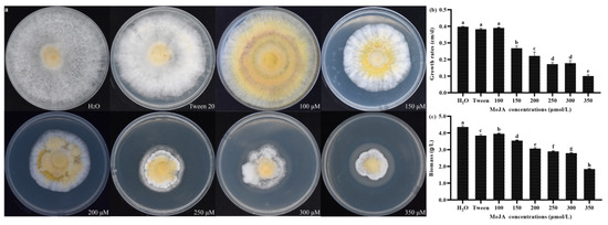Growth of S. baumii colonies on PDA (potato dextrose agar) medium supplemented with different concentrations of MeJA. (a) Colony morphology; (b) growth rate; (c) biomass. The mean difference being significant at the 0.05 level, p < 0.05.