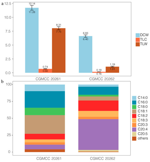 - Kikukawa, H.; Sakuradani, E.; Ando, A.; Okuda, T.; Shimizu, S.; Ogawa, J. Microbial production of dihomo-γ-linolenic acid by Δ5-desaturase gene-disruptants of Mortierella alpina 1S-4. J. Biosci. Bioeng. 2016, 122, 22–26. [Google Scholar] [CrossRef] [Green Version]